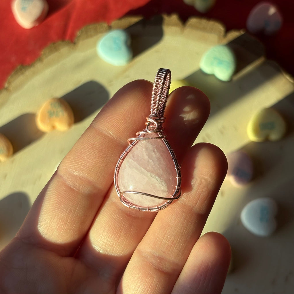 Morganite wrapped in pink copper wire. Includes a necklace cord