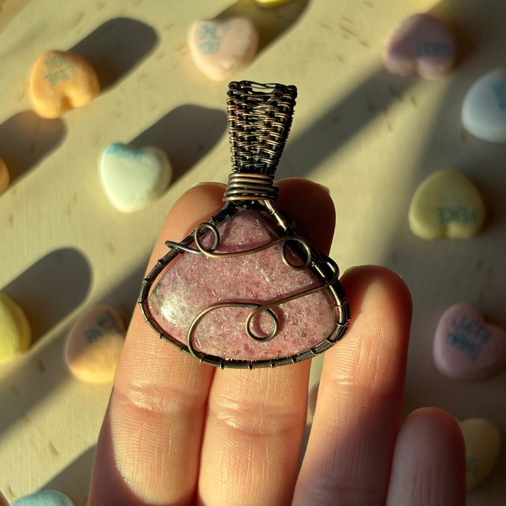 Rhodonite wrapped in copper wire. Includes a necklace cord
