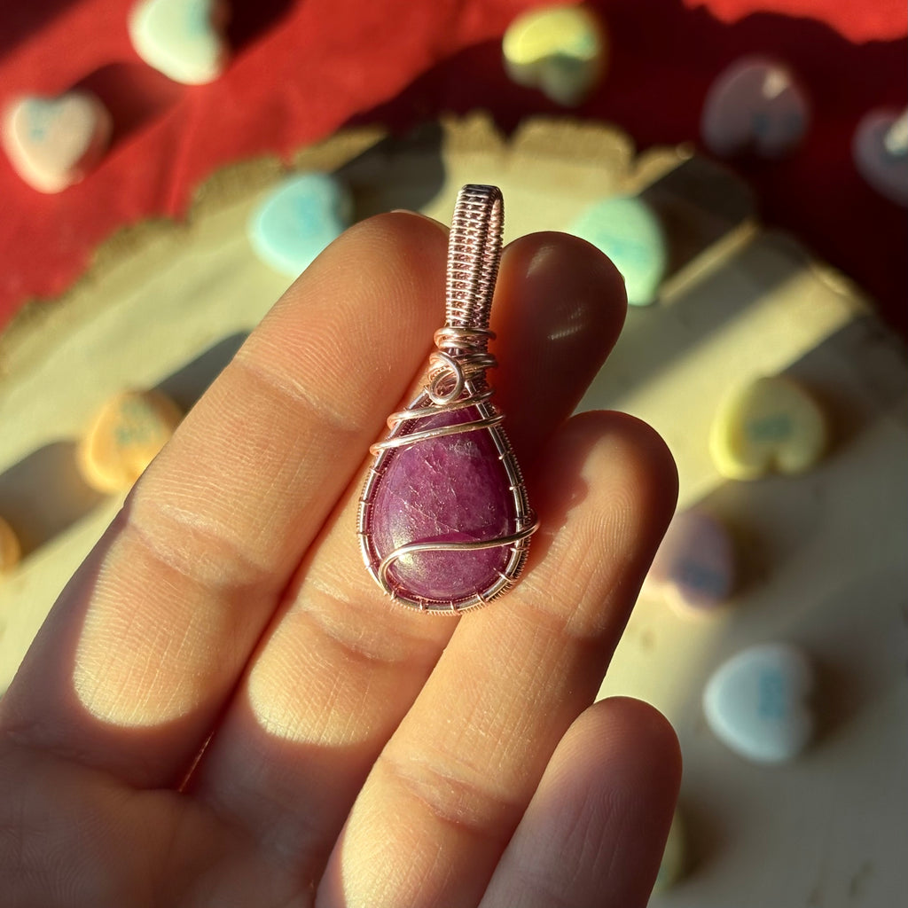 Ruby wrapped in pink copper wire. Includes a necklace cord