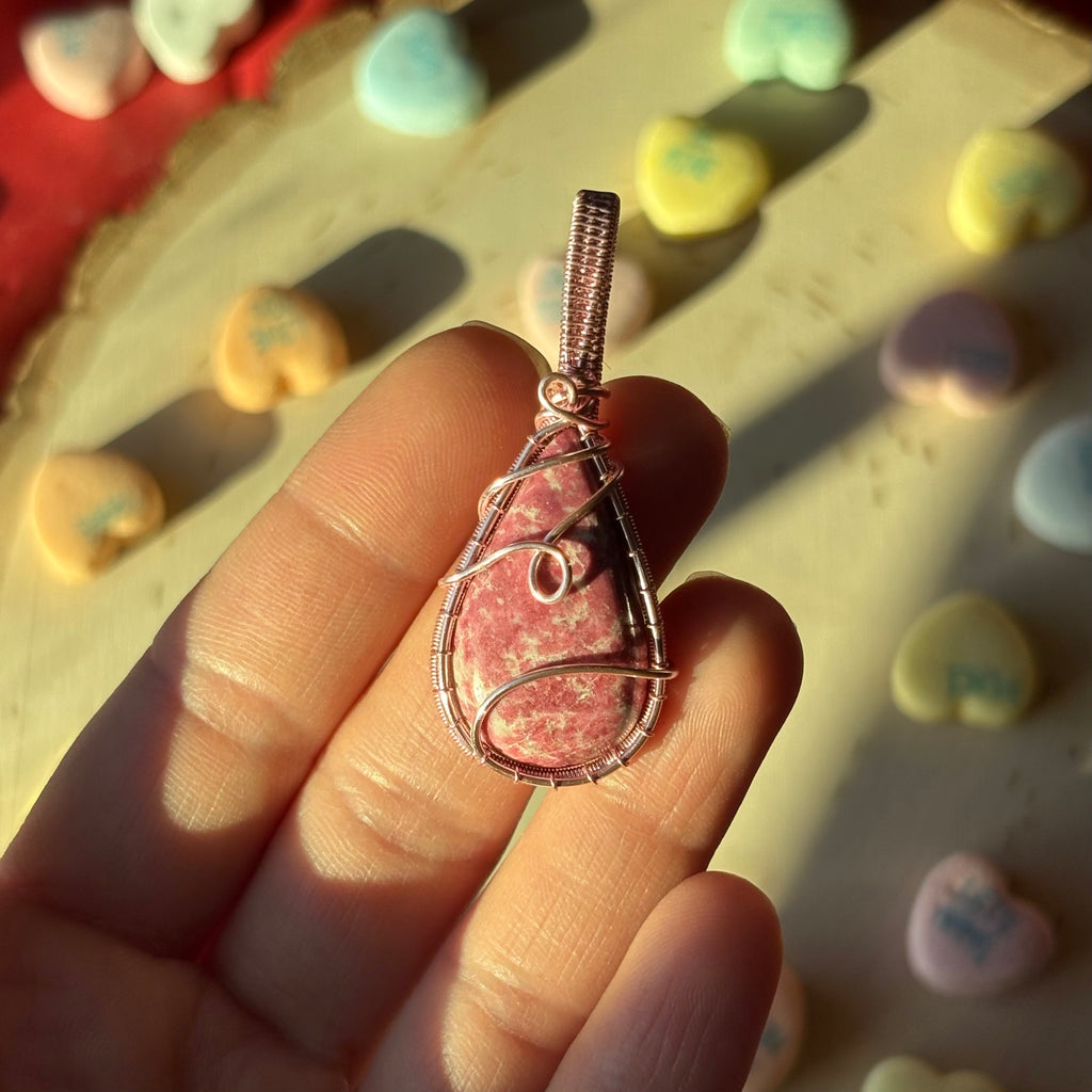 Thulite wrapped in pink copper wire. Includes a necklace cord