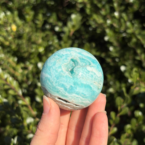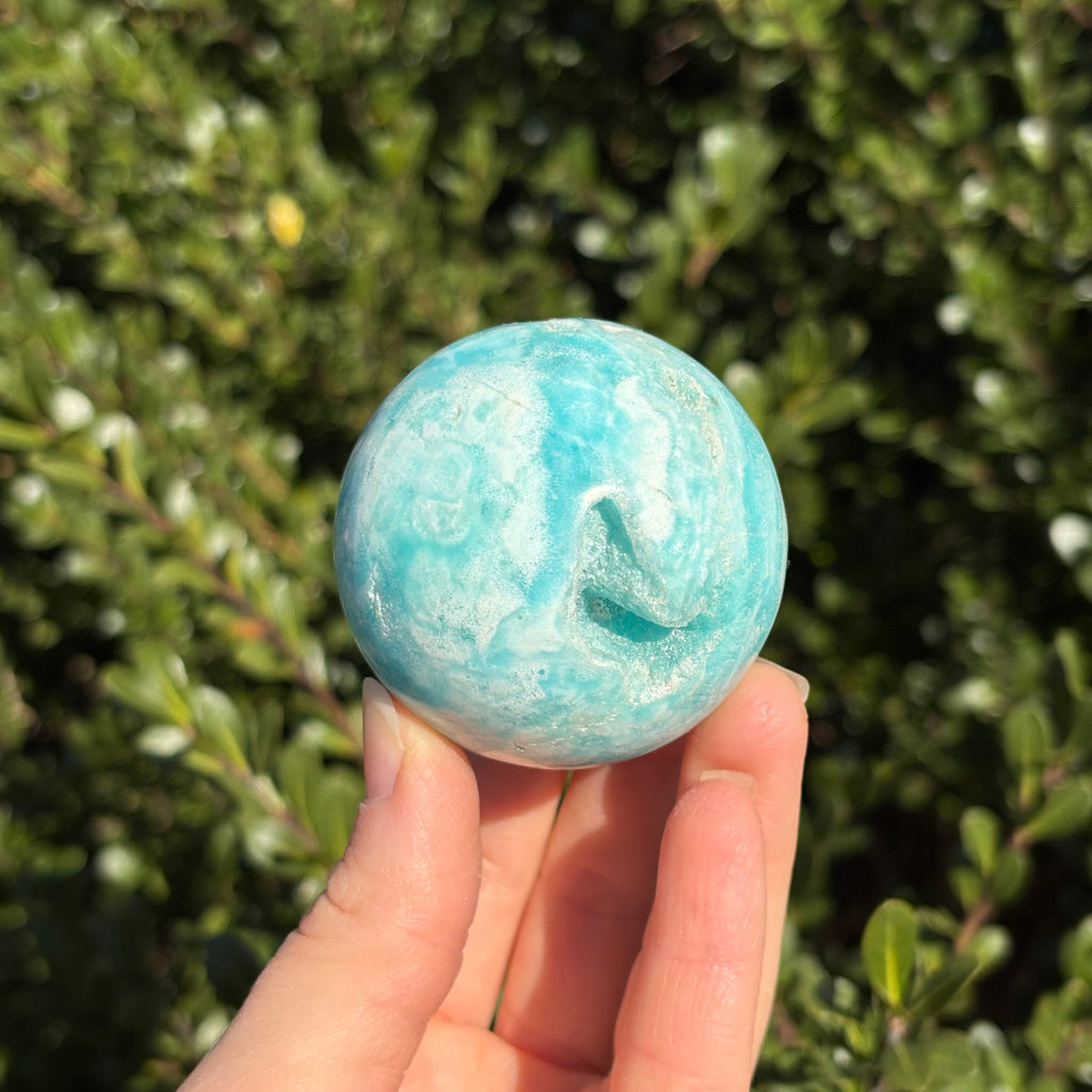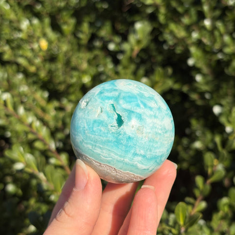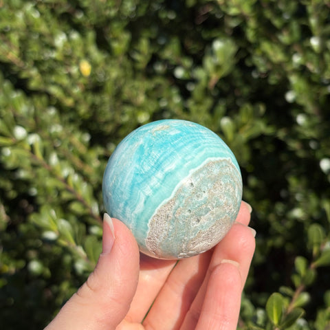 Blue aragonite is a mineral very similar to Caribbean calcite, but less geologically stable! When left in the Earth under pressure, aragonite will turn into calcite. Blue aragonite is associated with the third eye and throat chakras. It promotes empathy, compassion, and good communication.