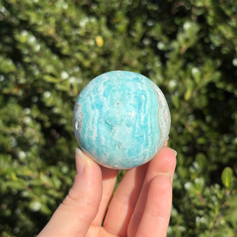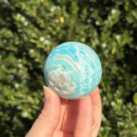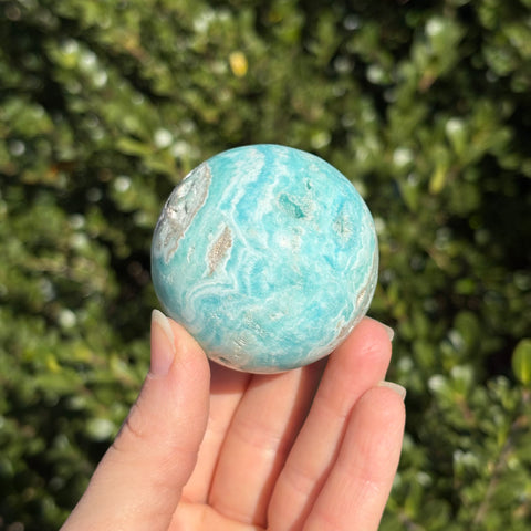Blue aragonite is a mineral very similar to Caribbean calcite, but less geologically stable! When left in the Earth under pressure, aragonite will turn into calcite. Blue aragonite is associated with the third eye and throat chakras. It promotes empathy, compassion, and good communication.