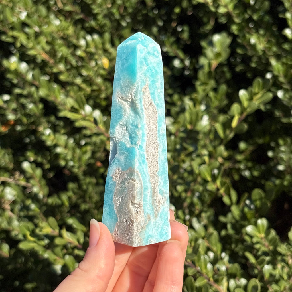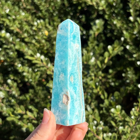 Blue aragonite is a mineral very similar to Caribbean calcite, but less geologically stable! When left in the Earth under pressure, aragonite will turn into calcite. Blue aragonite is associated with the third eye and throat chakras. It promotes empathy, compassion, and good communication.