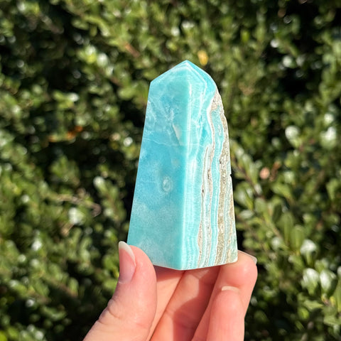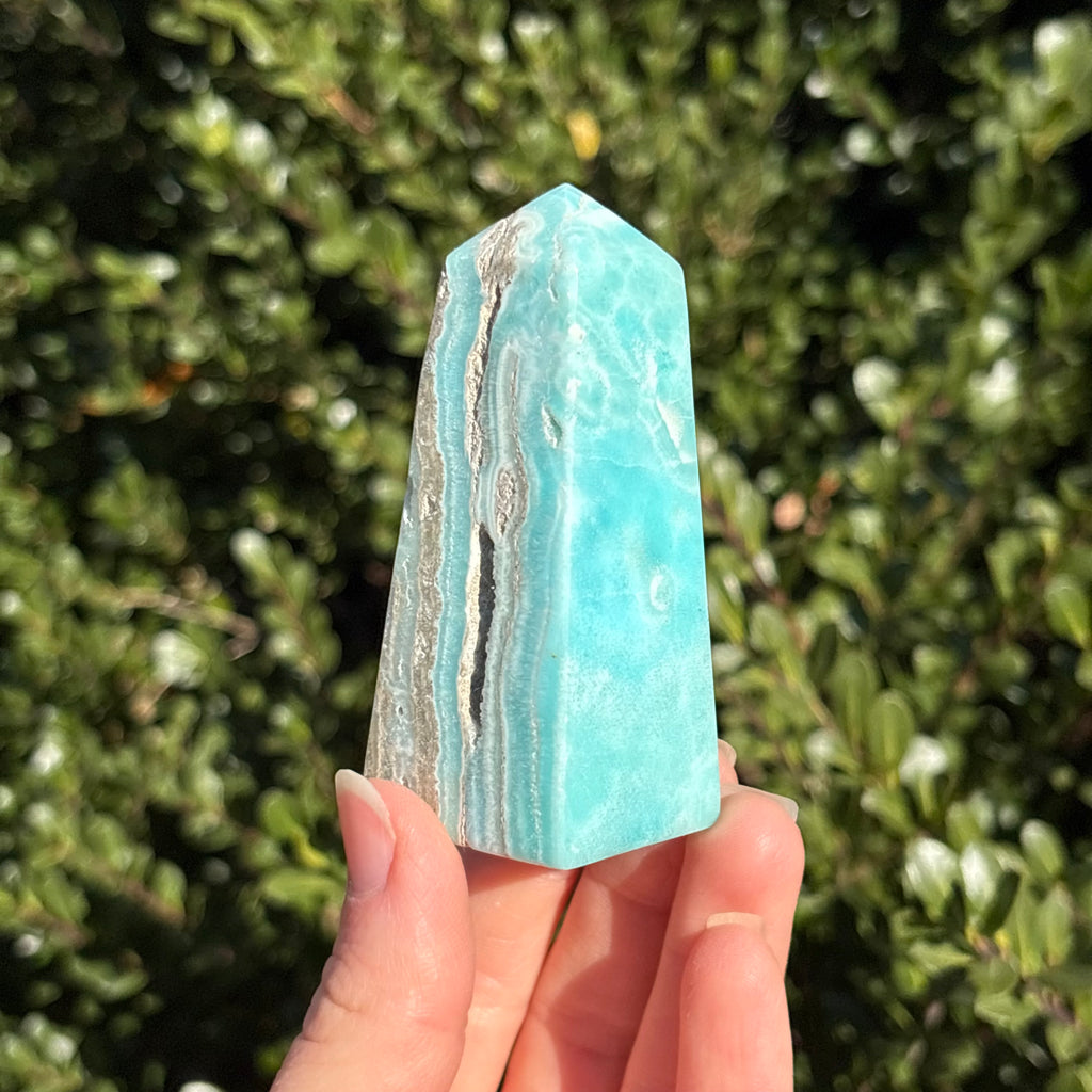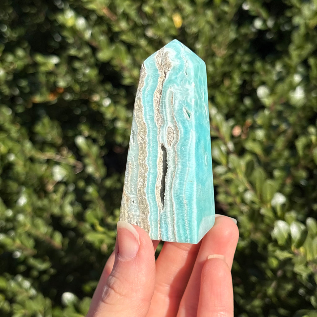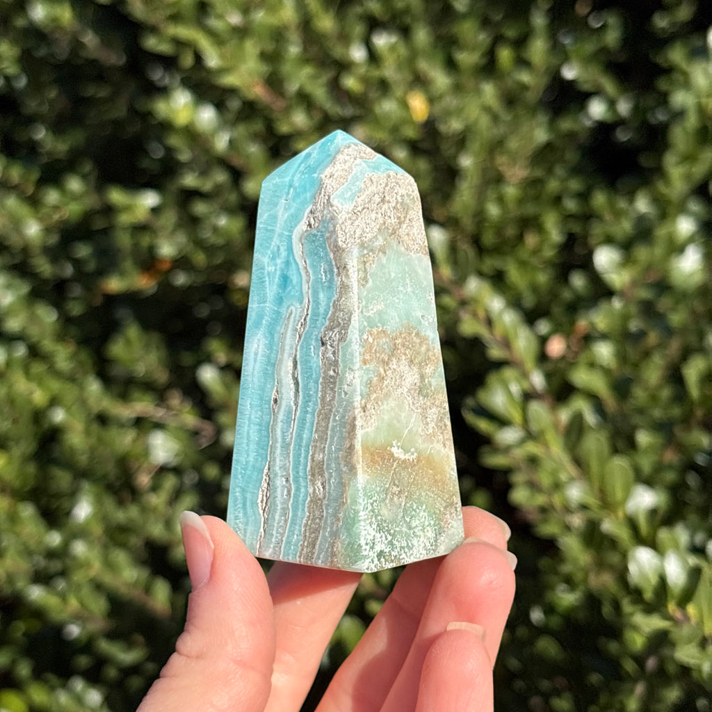 Blue aragonite is a mineral very similar to Caribbean calcite, but less geologically stable! When left in the Earth under pressure, aragonite will turn into calcite. Blue aragonite is associated with the third eye and throat chakras. It promotes empathy, compassion, and good communication.