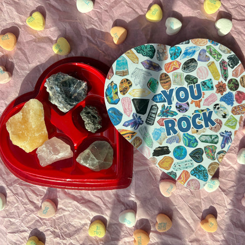 You Rock box: Includes raw orange calcite, raw rose quartz, raw pyrite, raw sodalite, and raw fluorite