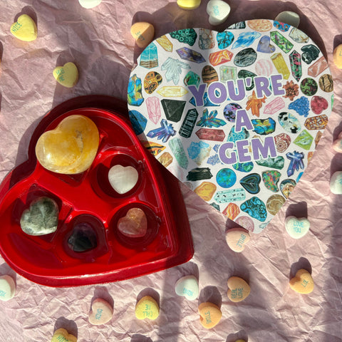 You’re a Gem box: Includes golden healer heart, labradorite heart, amethyst heart, rose quartz heart, and clear quartz heart